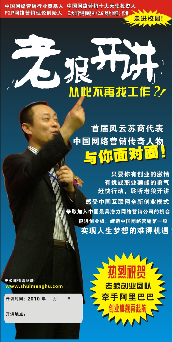 《老狼开讲》作为品牌课程,在沉默了2年后,今天再次吹响号角。首场启动仪式将于本月20号正式走进苏州农大!不过这次开讲,与两年前明显不同的是,老狼会以更睿智职场角度,全面阐述从创业--被投资--投资三个不同职业生涯累积的企业文化和对人文深刻的剖析。希望有意向合作的大学和培训机构,共同联手,将这一经典的课程带给即将毕业的学生以一种全新的就业观念和职场理念!