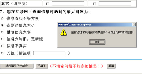 在填写调查问卷的第二部分的7个问题之后开始点提交“继续填写下一部分”时,居然弹出一个窗口提示:“您经常使用搜索引擎检索什么信息没有填写完整”,不允许我继续进行问卷提交,当然前面的内容也白填了。费了半天功夫,居然根本没办法完成完整的在线调查问卷。