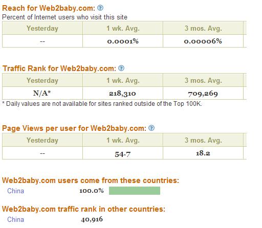 我们可以看到增加了“Web2baby.com users come from these countries:”和“Web2baby.com traffic rank in other countries:”两项。从图中可以看到,我的博客(www.web2baby.com)的用户主要全部来自中国(大陆区),在中国(大陆区)的排名是“40,916”。